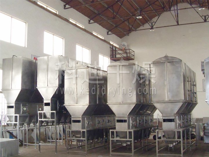 沸腾干燥,又称流化床,它是由空气过滤器、加热器、沸腾床主机,旋风分离器,布袋除尘器、高压离心风机、操作台组成,由于干燥物料的性质不同,配套除尘设备时,可按需要考虑,可同时选择旋风分离器、布袋除尘器,也可选择其中一种,一般来说比重较大的如冲剂及颗粒料干燥只需选择旋风分离器,比重较轻的小颗粒状和粉状物料需配套布袋除尘器,并备有气力送料装置及皮带输送机供选择。